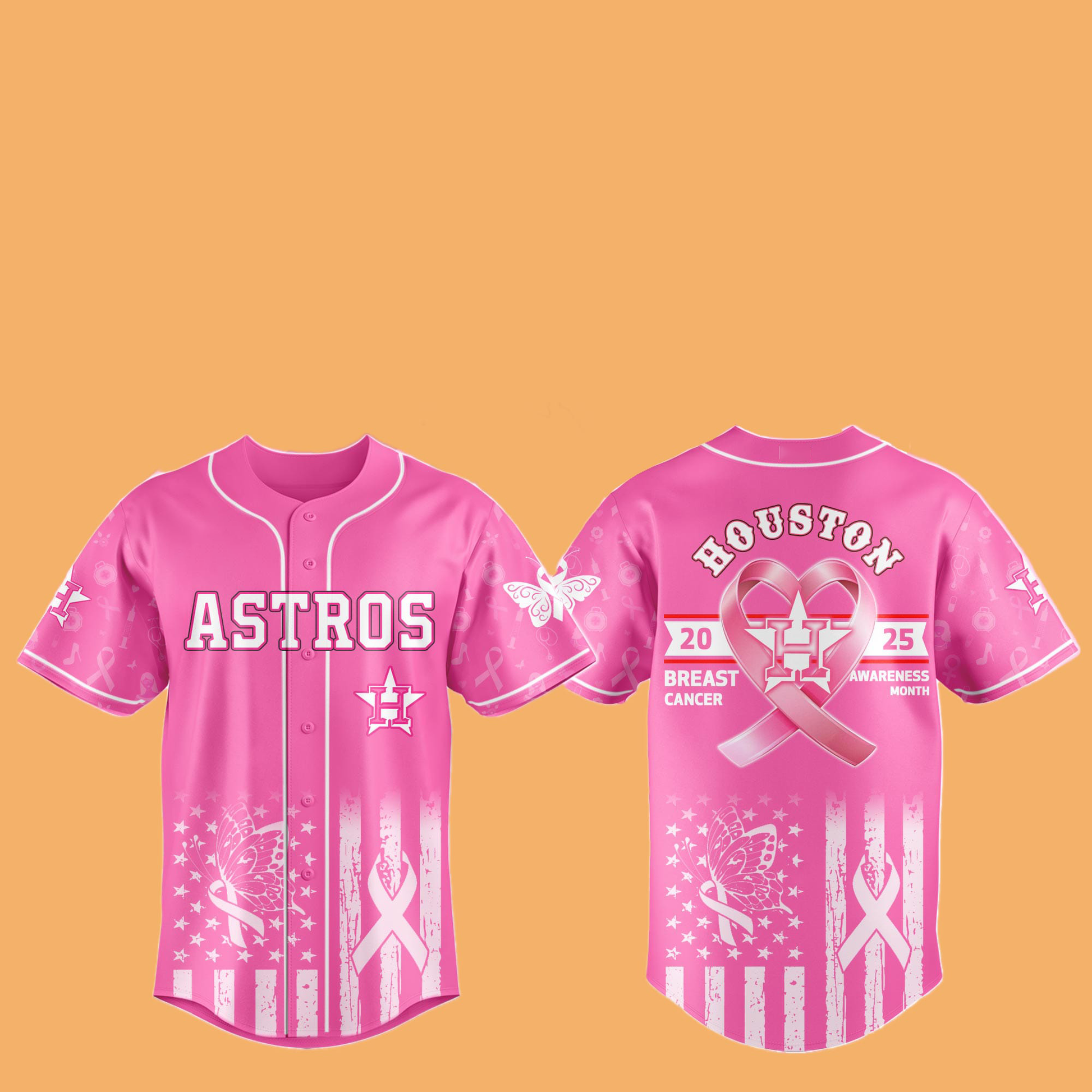 Elevate your game-day look while championing a cause with the 2025 Astros Special Breast Cancer Awareness Month Hat and Jersey. This set combines the iconic Houston Astros branding with vibrant pink hues and meaningful ribbon motifs, designed for fans, survivors, and supporters alike. Crafted from premium, moisture-wicking performance fabric, the jersey features a button-front design, bold “ASTROS” lettering, and a compassionate butterfly-ribbon graphic over an American-flag inspired pattern. The matching structured cap showcases the year “20 25,” a heart-shaped ribbon entwined with the Astros “H” logo, and subtle breast-cancer icons woven into the fabric.