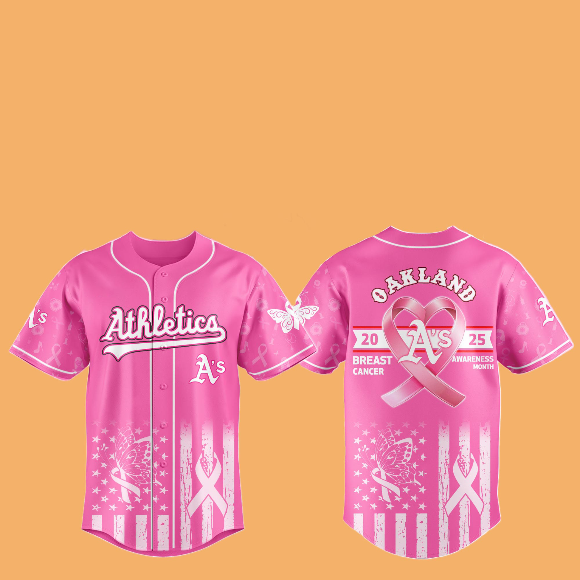 Iconic Athletics Branding: Embroidered “A’s” logo and “2025 Breast Cancer Awareness Month” text are prominently displayed on both pieces, so your support is unmistakable. The back of the jersey proudly bears the date “10.2025” alongside the signature pink ribbon, tying style to purpose.