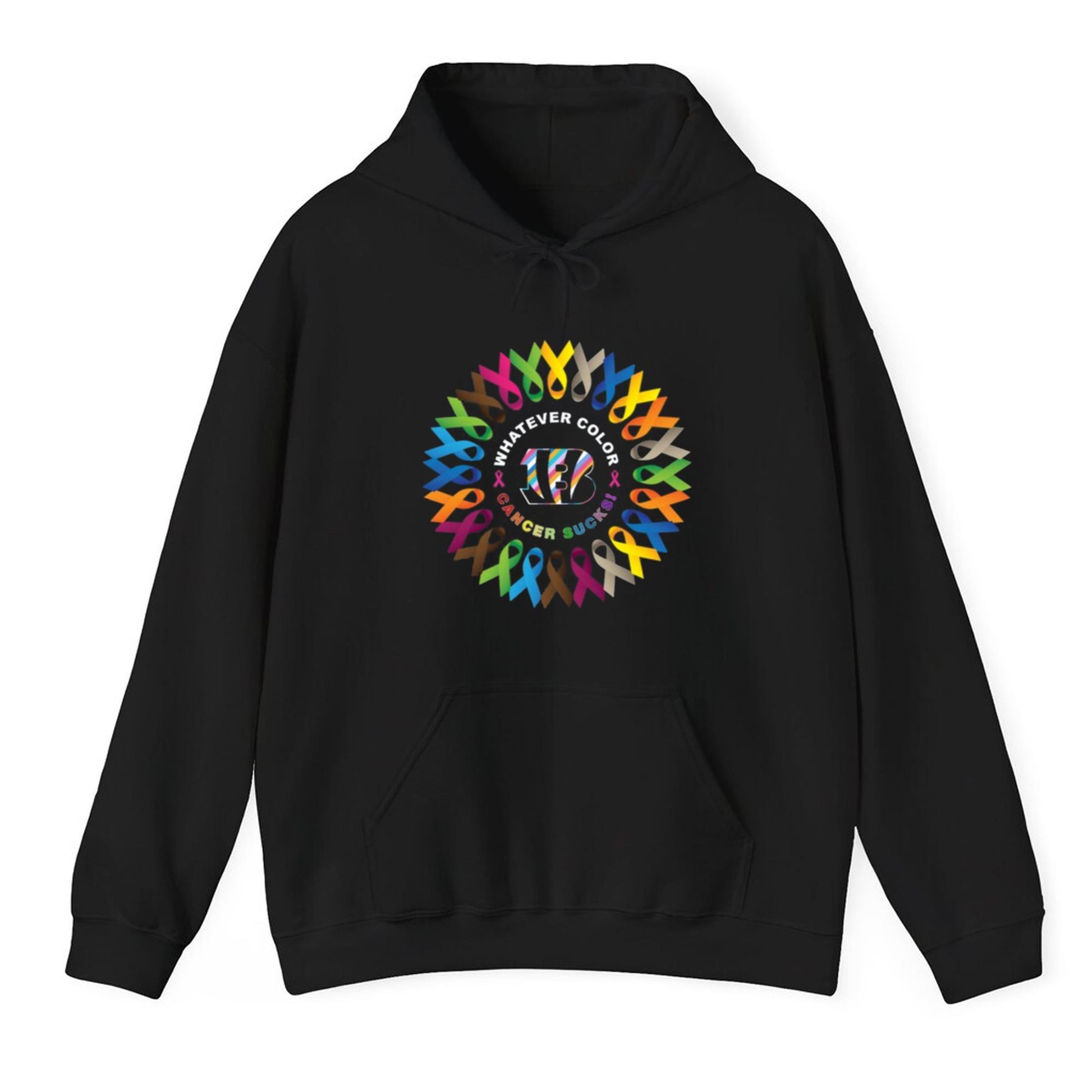 Crafted from high-quality cotton, the 2025 Bengals "Whatever Color Cancer Sucks" Shirt is designed for comfort and durability. Available in both a classic crew-neck T-shirt and cozy hoodie, each version features a vibrant display of multi-colored ribbons in a circle, surrounding the message "Whatever Color Cancer Sucks." This visual representation speaks to the many types of cancer, emphasizing the universal fight against the disease, regardless of color or type.