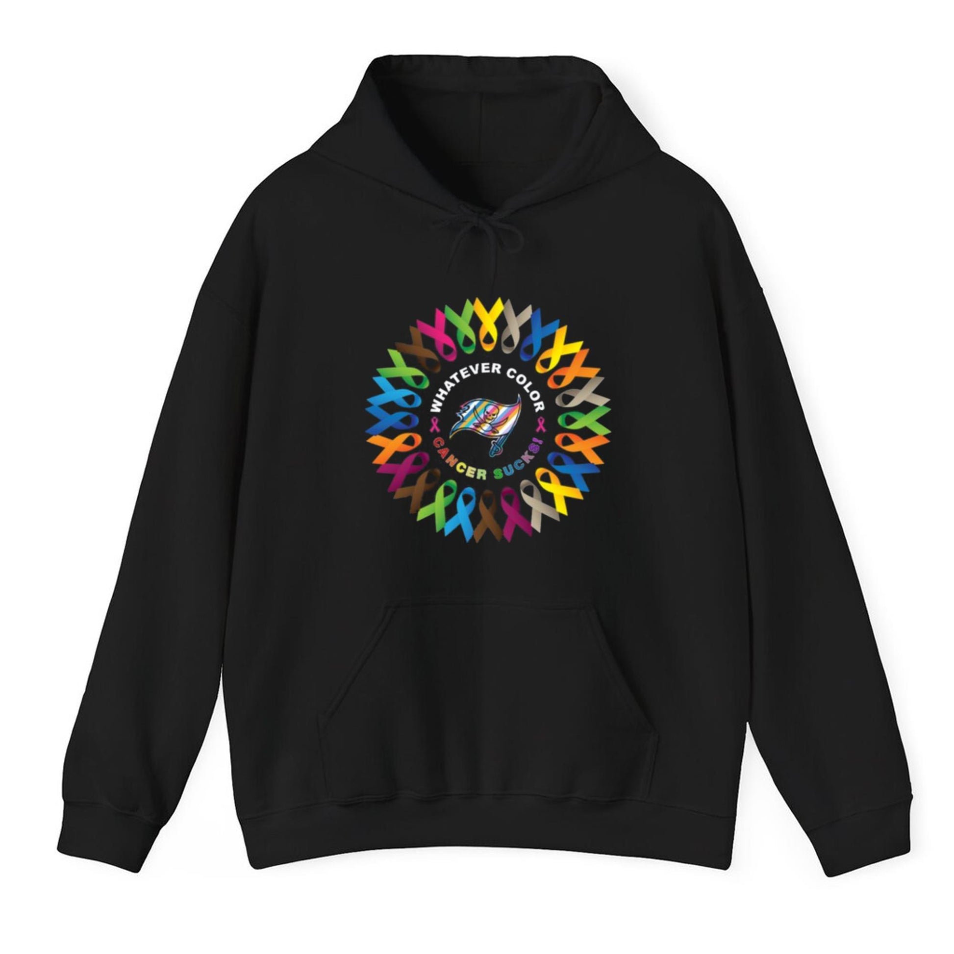 Made from high-quality, soft cotton, this shirt features a striking graphic at the center—a circle of vibrant cancer awareness ribbons in every color of the rainbow, symbolizing the diverse types of cancer that affect millions worldwide. The message at the center, "Whatever Color Cancer Sucks," is a powerful declaration of support and unity in the fight against cancer, no matter the type.