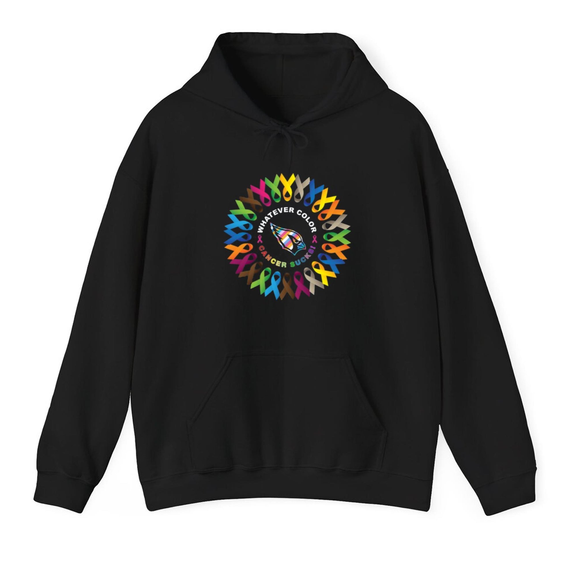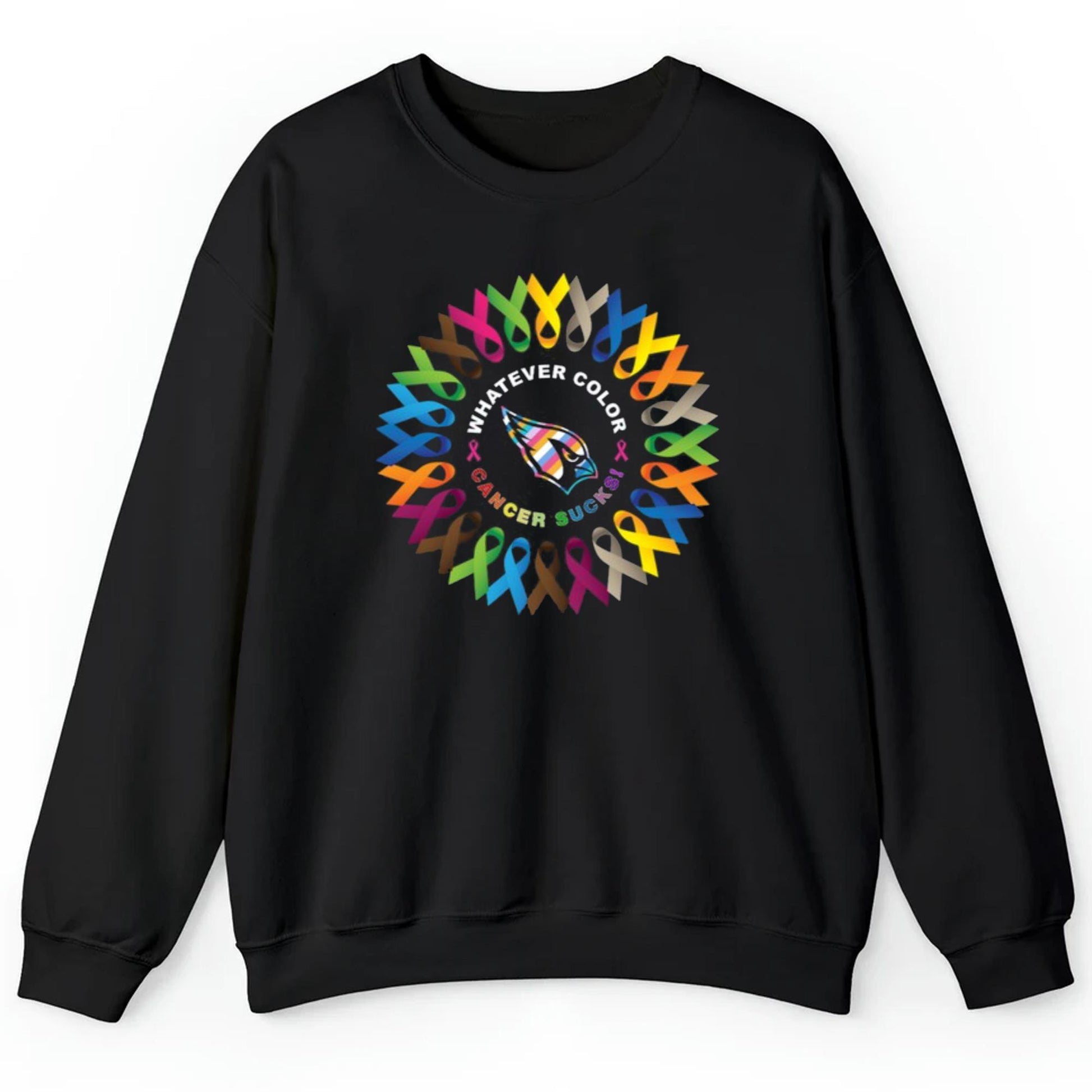 A Powerful Message: The shirt boldly features the phrase "Whatever Color Cancer Sucks" surrounded by a rainbow of colorful ribbons. This design celebrates diversity in the fight against cancer, supporting individuals with all types of cancer and showing solidarity across communities.