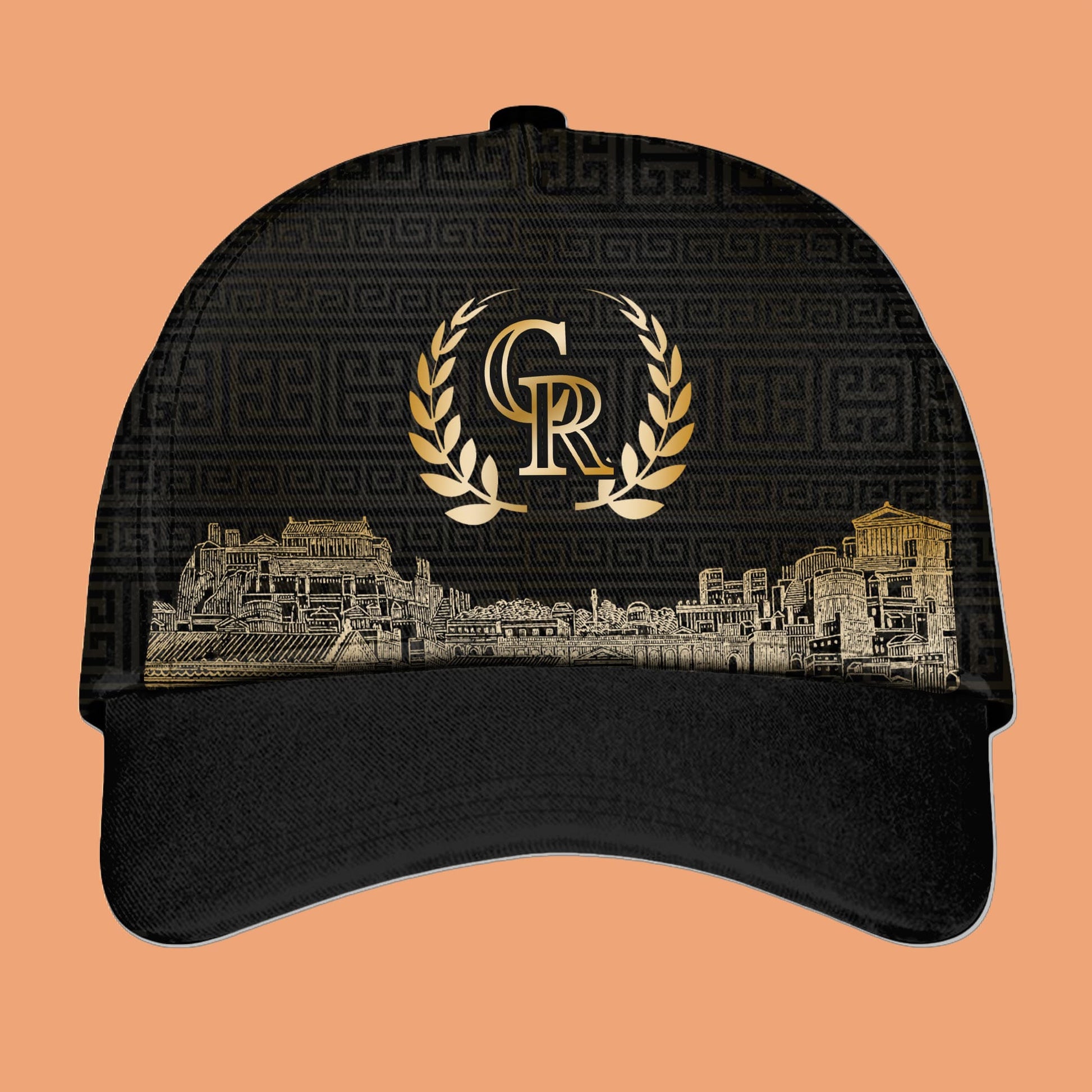 The Spartacus Rockies 2025 hat is the perfect accent to complete your outfit. In a similarly sleek black and gold color scheme, the hat features a gold laurel wreath and signature “CR” initials, symbolizing your connection to both the Rockies and the Spartacus spirit. The ancient Roman skyline adds historical depth, making this hat a true collector's item.