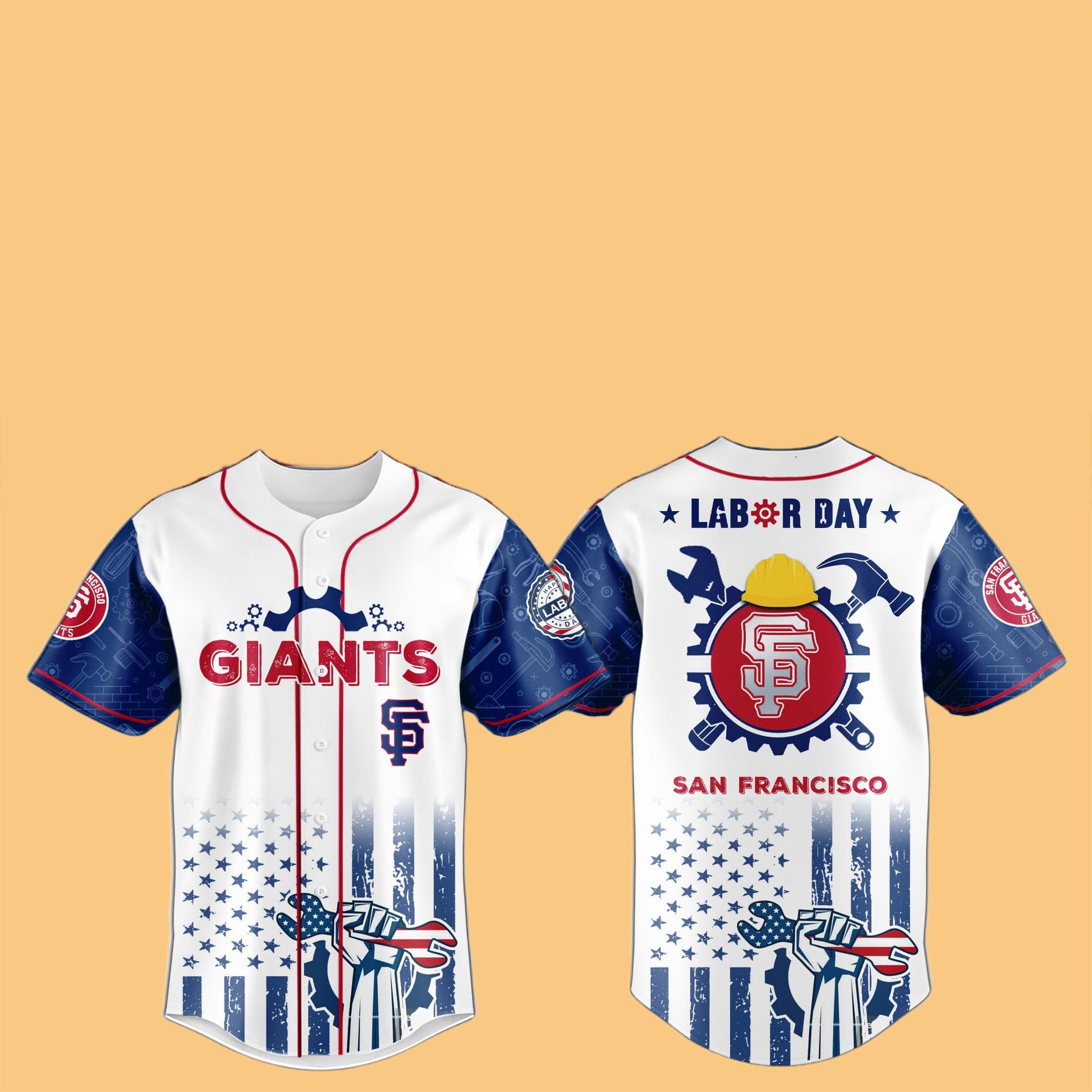 On the other hand, the Labor Day Jersey combines the traditional SF Giants aesthetics with a modern twist. It proudly displays the GIANTS logo across the chest, while the back features “Labor Day” in bold letters, honoring the significance of the holiday. The sleeves are adorned with eye-catching imagery, including tools and the iconic Statue of Liberty, highlighting the union of American labor and patriotism. The stars and stripes of the American flag complete the design, making this jersey a true standout.