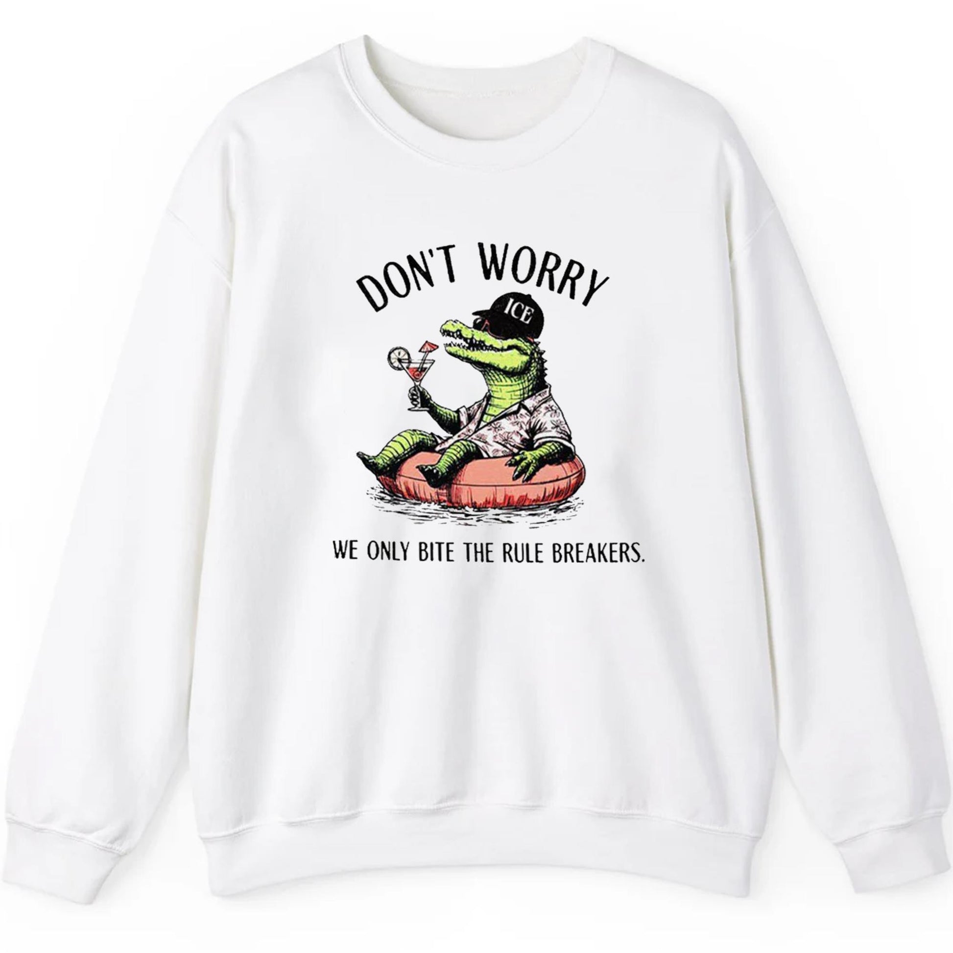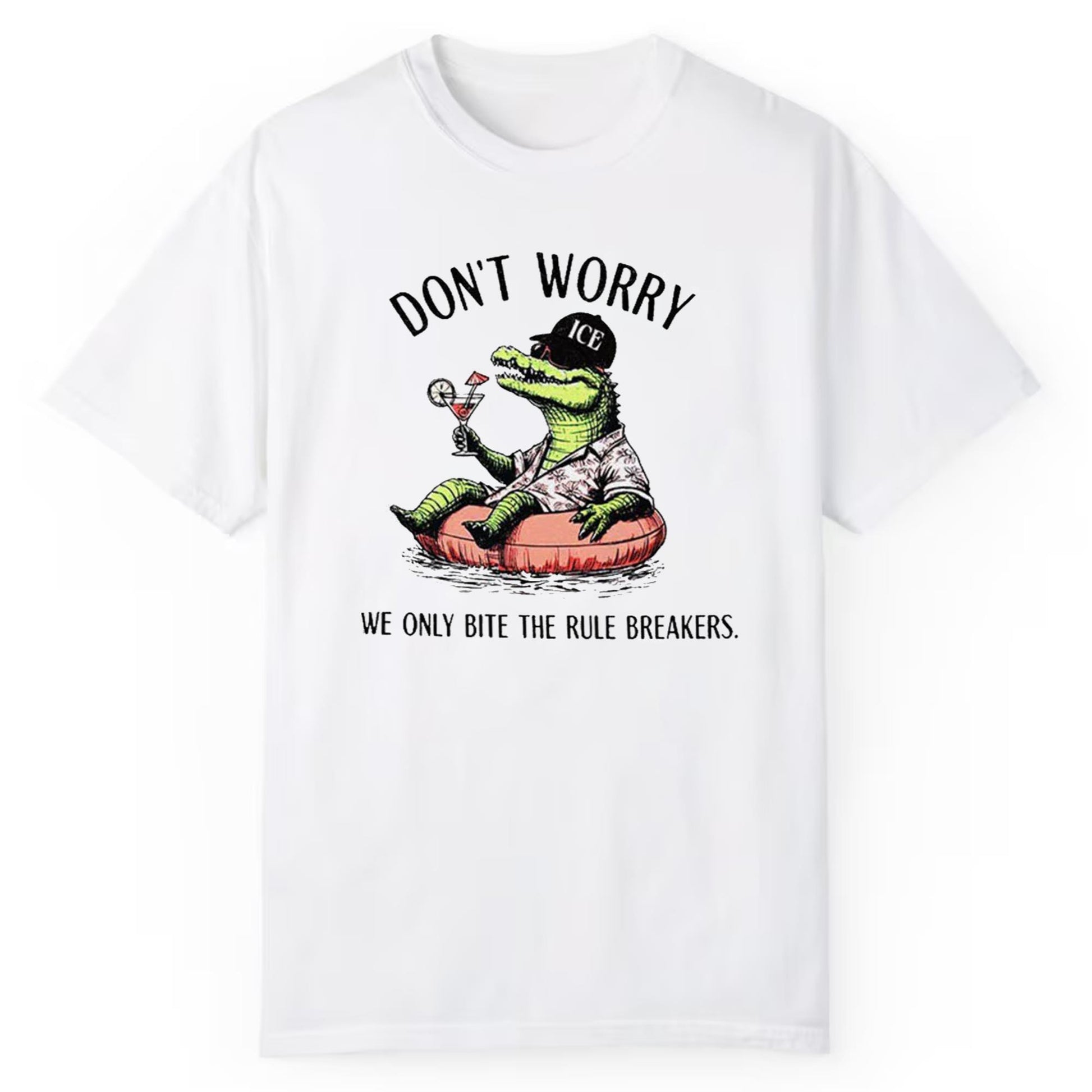 Step into a world of fearless fashion with the Alligator Alcatraz "Don't Worry We Only Bite The Rule Breakers" Shirt. This unique apparel piece captures attention with its quirky graphic of a relaxed alligator sporting sunglasses and a hat labeled "ICE," lounging on a float and sipping a cocktail. Paired with the empowering phrase, it’s more than just clothing — it’s an attitude. Perfect for those who live by their own rules and aren't afraid to show it, this shirt is designed for individuals who want to blend comfort with a bold statement.