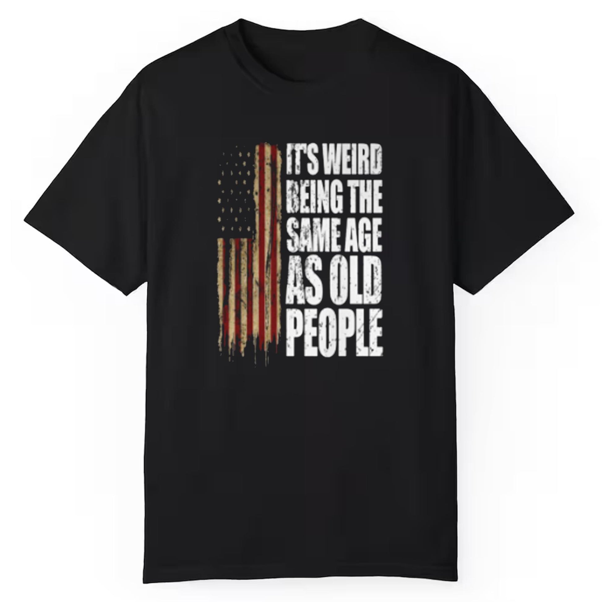 The America It's Weird Being The Same Age As Old People Shirt is the perfect blend of humor, patriotism, and style. This bold and eye-catching shirt is designed for those who love to make a statement, whether it's in casual settings, parties, or simply showing off your sense of humor. Featuring a distressed American flag design paired with the witty phrase “It’s Weird Being The Same Age As Old People,” this shirt is sure to turn heads and spark conversations wherever you go.
