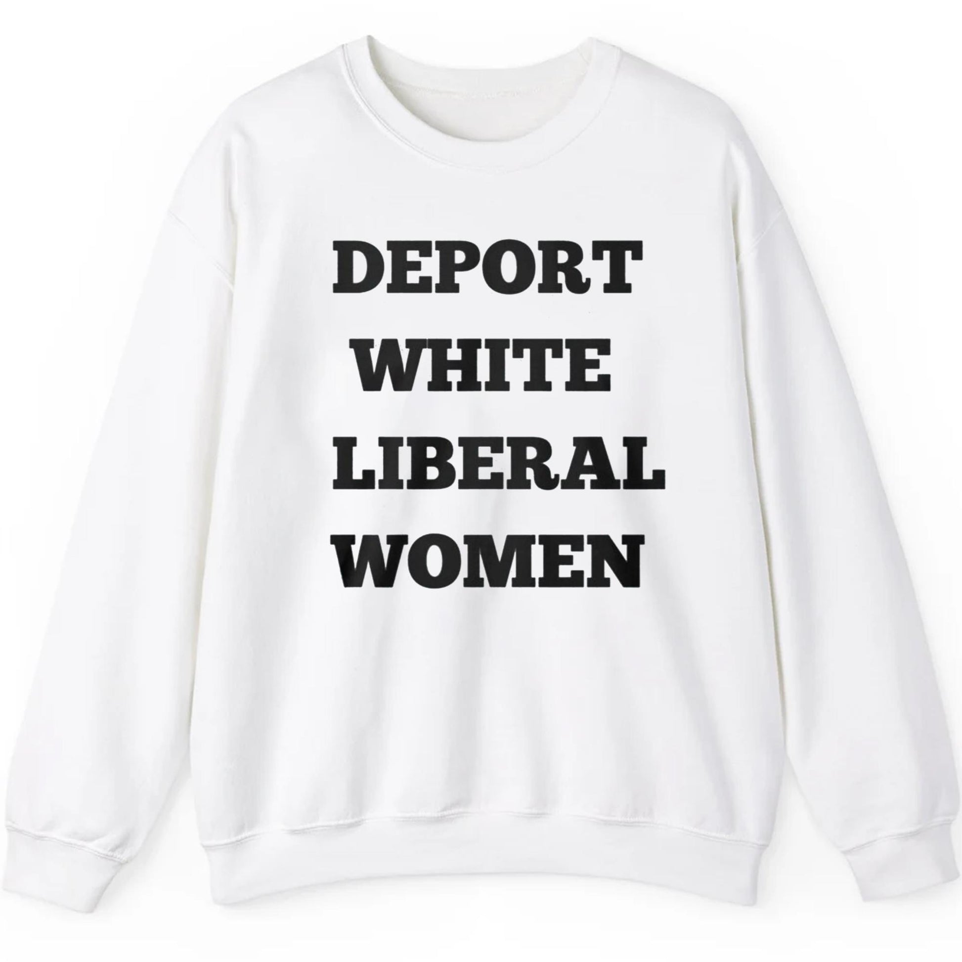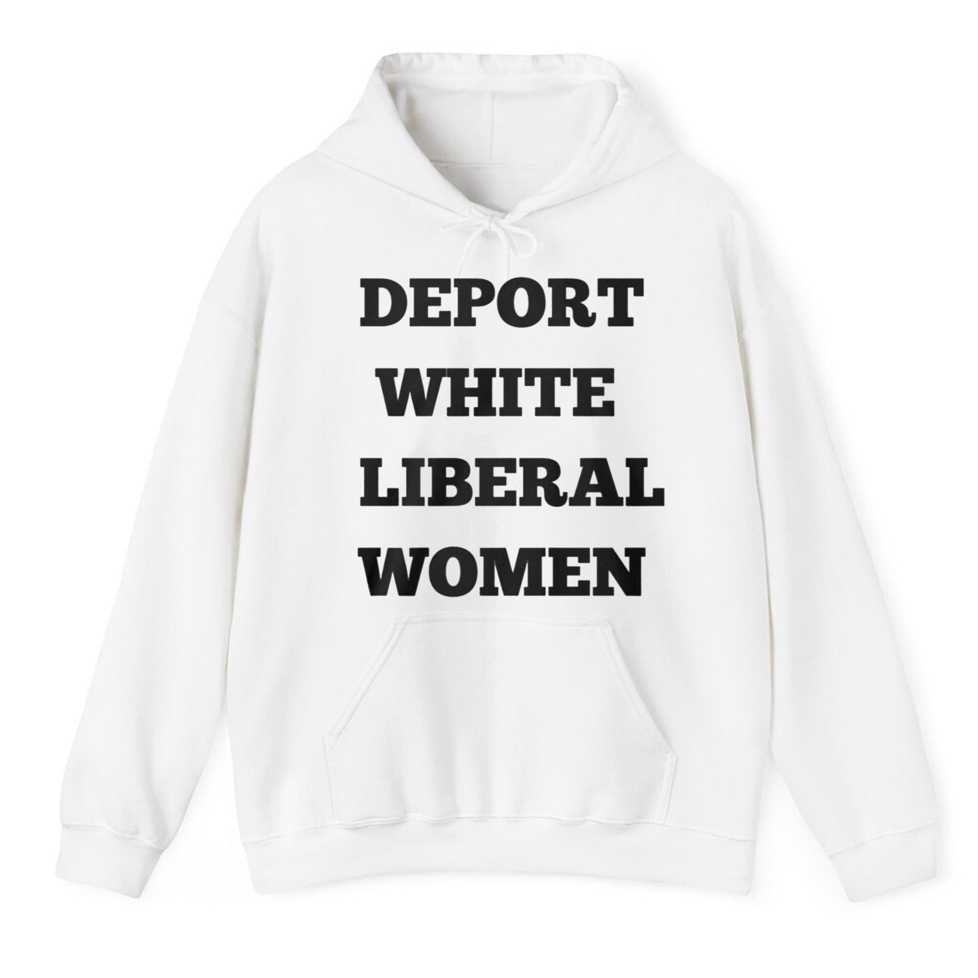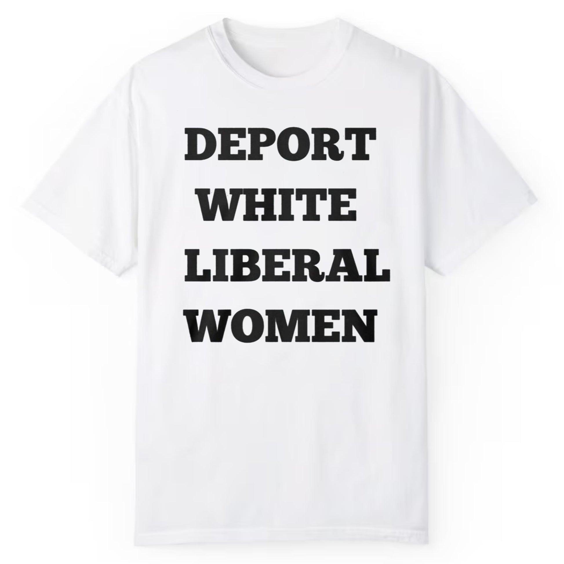Bold Typography Design: The statement-making text "DEPORT WHITE LIBERAL WOMEN" is printed in large, black letters across the front, ensuring you turn heads wherever you go. It’s designed to stand out and make an impact, helping you express your views with style.