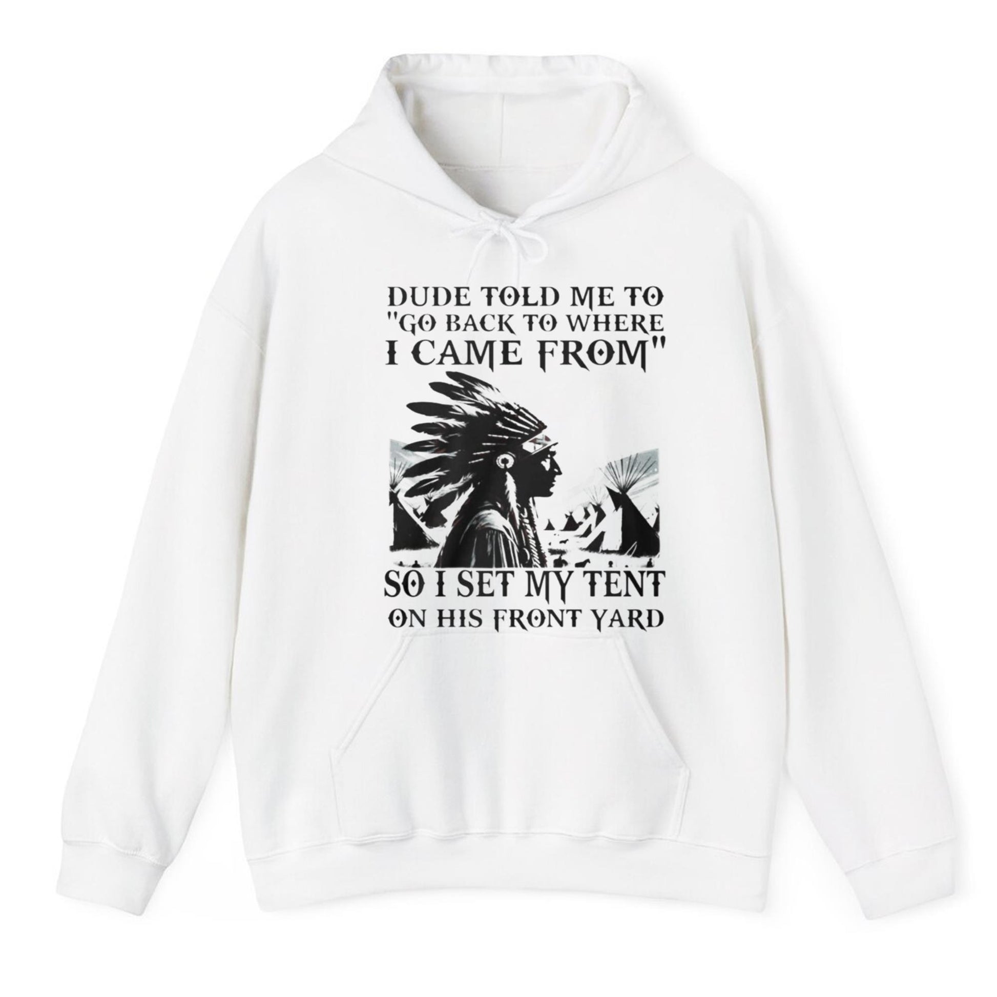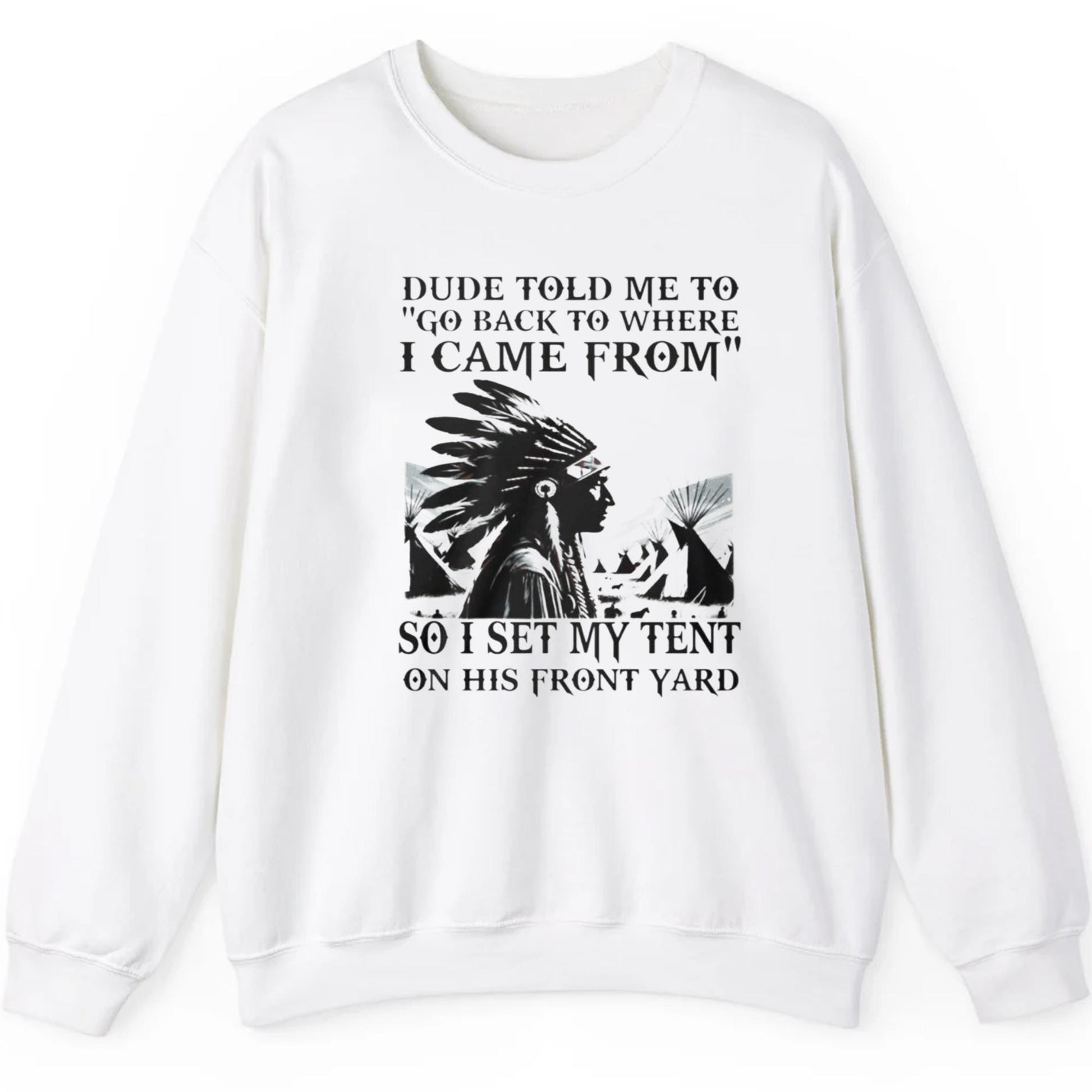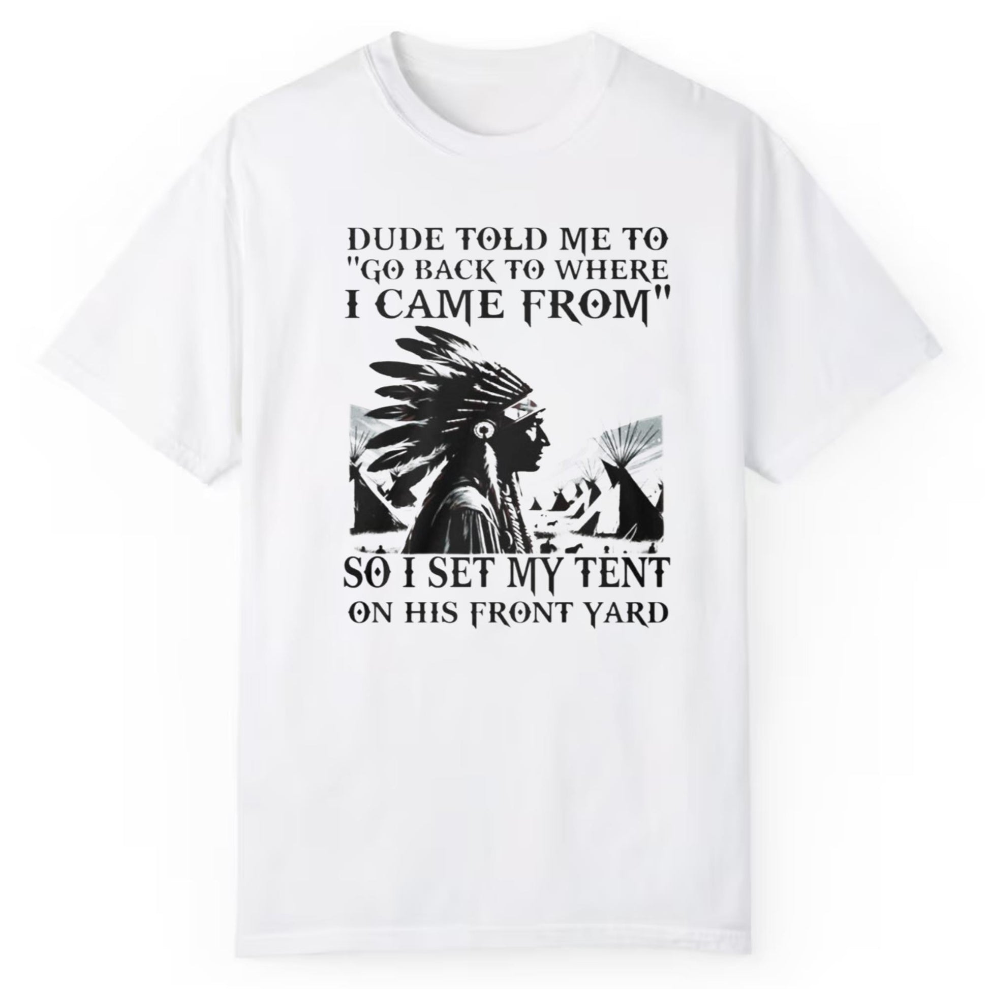 Are you someone who enjoys expressing themselves with bold and powerful statements? The "Dude Told Me To Go Back To Where I Came From So I Set My Tent On His Front Yard Shirt" is a unique and impactful piece that makes a statement both visually and socially. This shirt features an iconic design with a culturally rich image, merging artistic expression with thought-provoking humor. It’s perfect for anyone who is unapologetic about their heritage, their identity, and their pride in standing their ground.