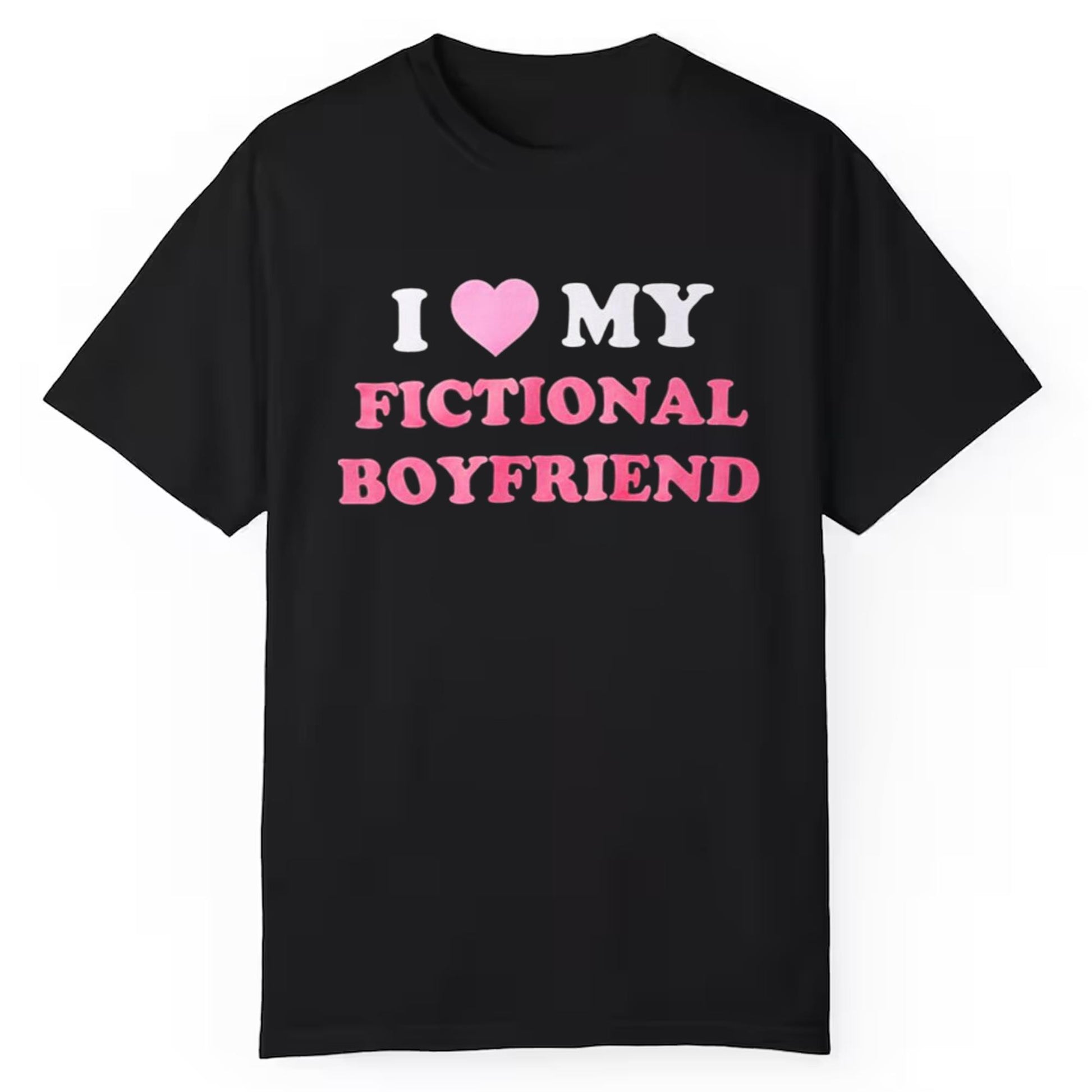 The shirt features bold, eye-catching typography with the phrase "I LOVE MY FICTIONAL BOYFRIEND" in a mix of white and vibrant pink lettering. The playful contrast makes the design stand out, while the soft fabric and classic fit make it easy to wear for any occasion. Whether you're lounging at home, attending a casual meetup with friends, or even heading out on a shopping spree, this shirt is a versatile addition to your wardrobe.