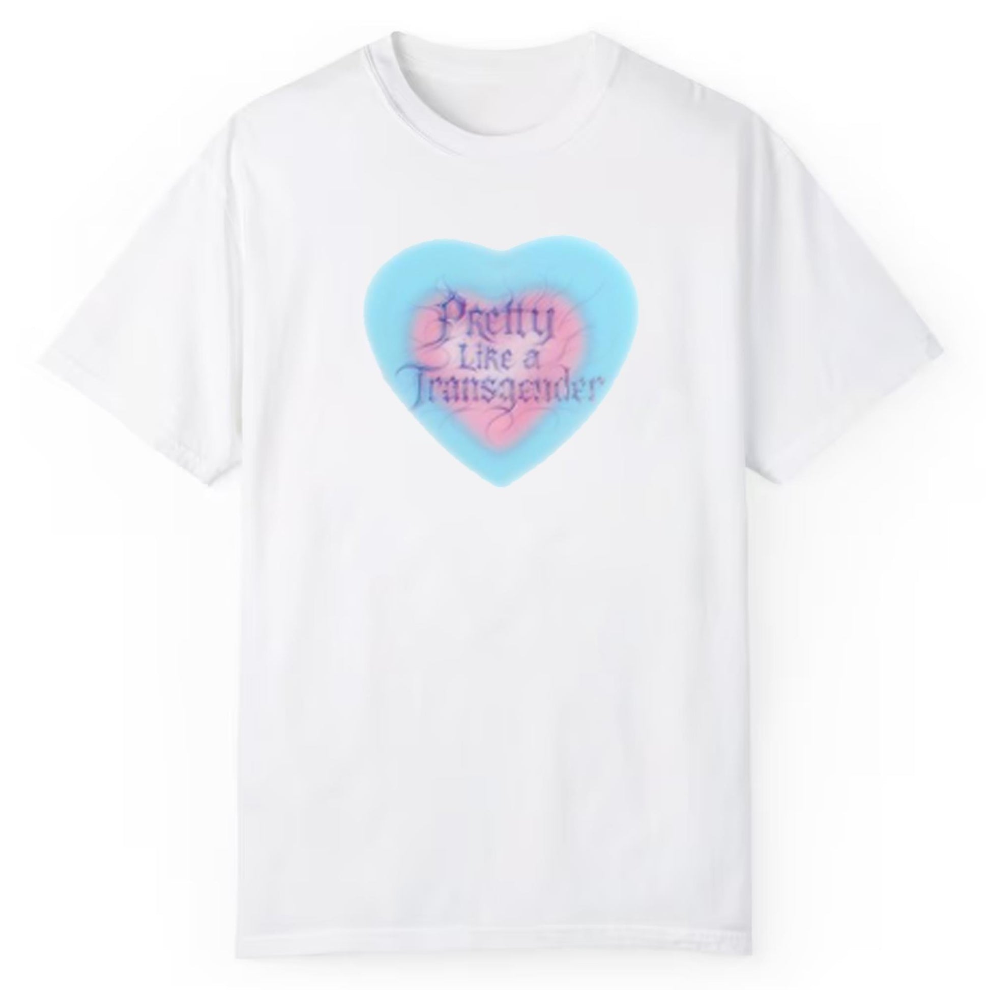 Design: The shirt features a heart-shaped graphic with the empowering message "Pretty Like A Transgender." The pink and blue tones of the heart represent the transgender flag, symbolizing the strength, resilience, and beauty of the transgender community.