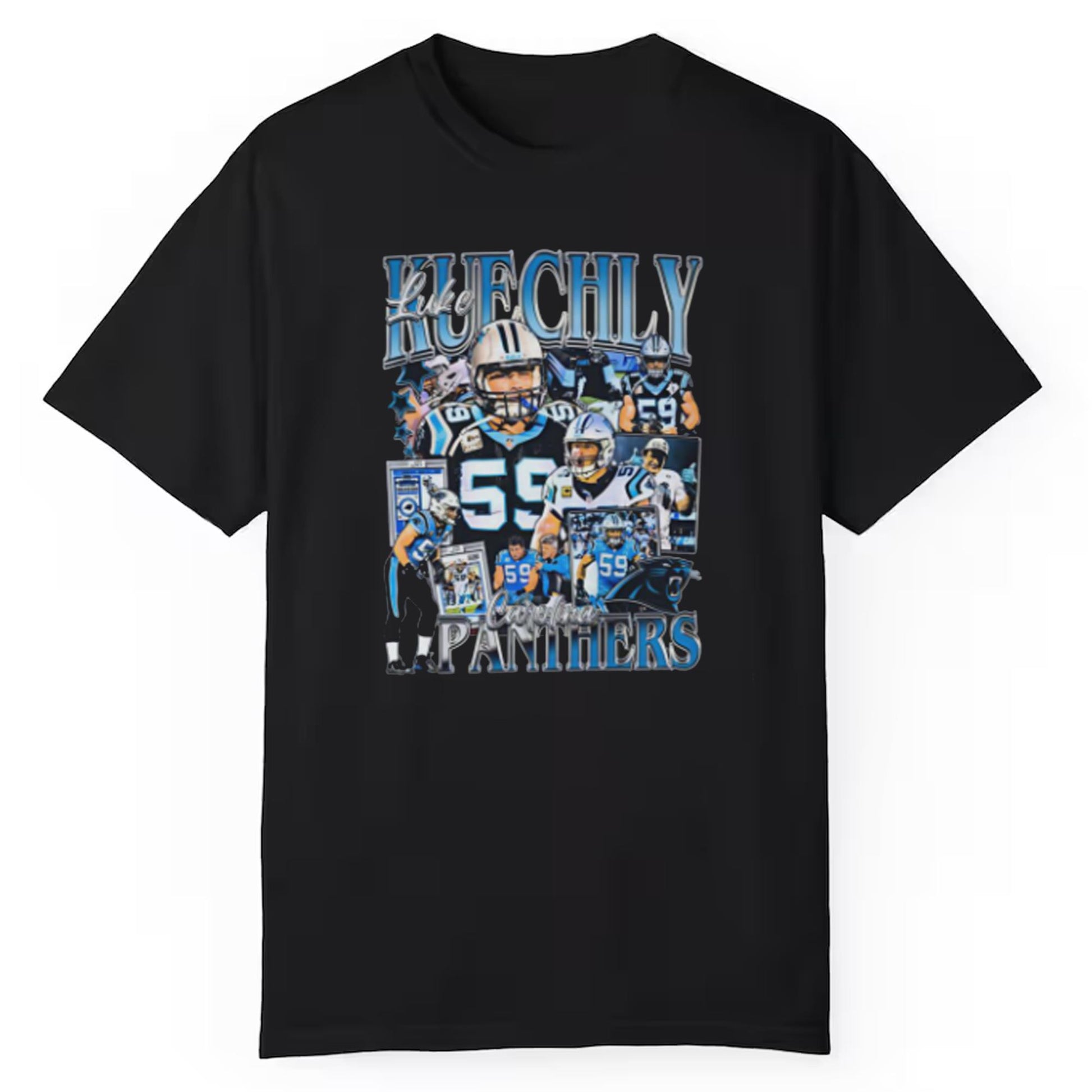 The graphic on the shirt features dynamic and vibrant images of Luke Kuechly in action, showcasing the linebacker’s legendary presence on the field. His iconic number 59 is proudly displayed, accompanied by images that capture his defensive strength and skill. This shirt doesn’t just tell the story of a player; it immortalizes his place in Carolina Panthers history.