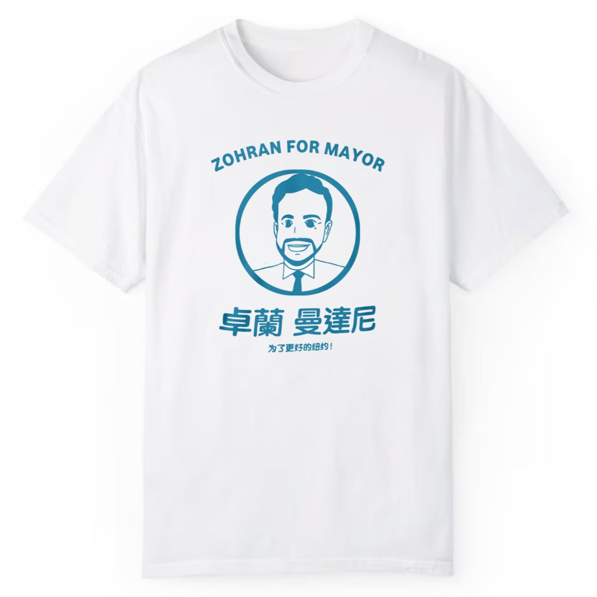 The graphic design on the Mamdani Zorhan For Mayor Shirt features an illustrated image of Zorhan, exuding a professional yet approachable demeanor. This design is accented with bold, clean lines that reflect the candidate's commitment to a modern, forward-thinking campaign. With the tagline "For a Better Community" written in both English and Chinese, it emphasizes Zorhan's inclusive approach and multicultural reach. This makes it an excellent choice for anyone who appreciates global perspectives and civic engagement.