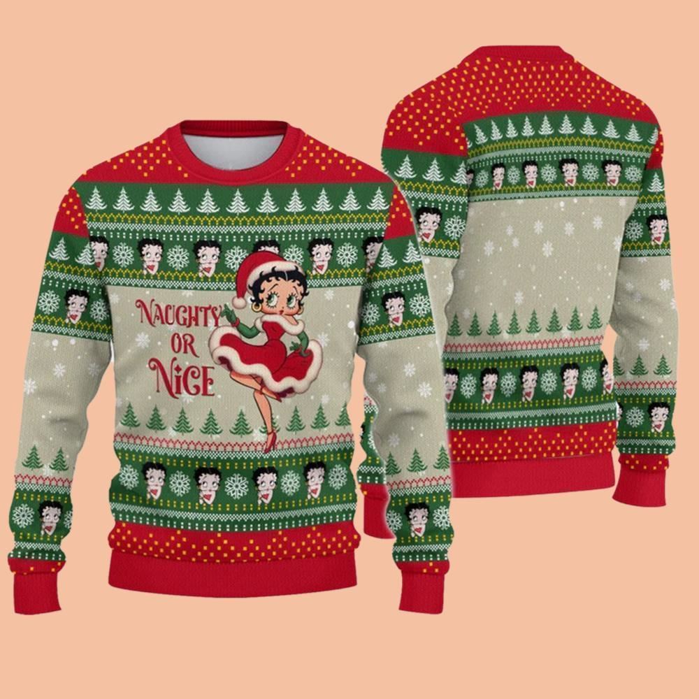 The this shirt stands out with its charming design and high-quality materials, making it a must-have for anyone looking to bring festive cheer to their wardrobe. The sweatshirt's design features Betty Boop, an iconic animated character, dressed in a holiday ensemble with a sparkling “Naughty or Nice” graphic. The classic red and green colors, along with snowflakes and Christmas trees, make this the ultimate ugly Christmas sweater for 2025. Whether you're looking for a unique gift or something special for yourself, this sweatshirt delivers on both style and comfort.