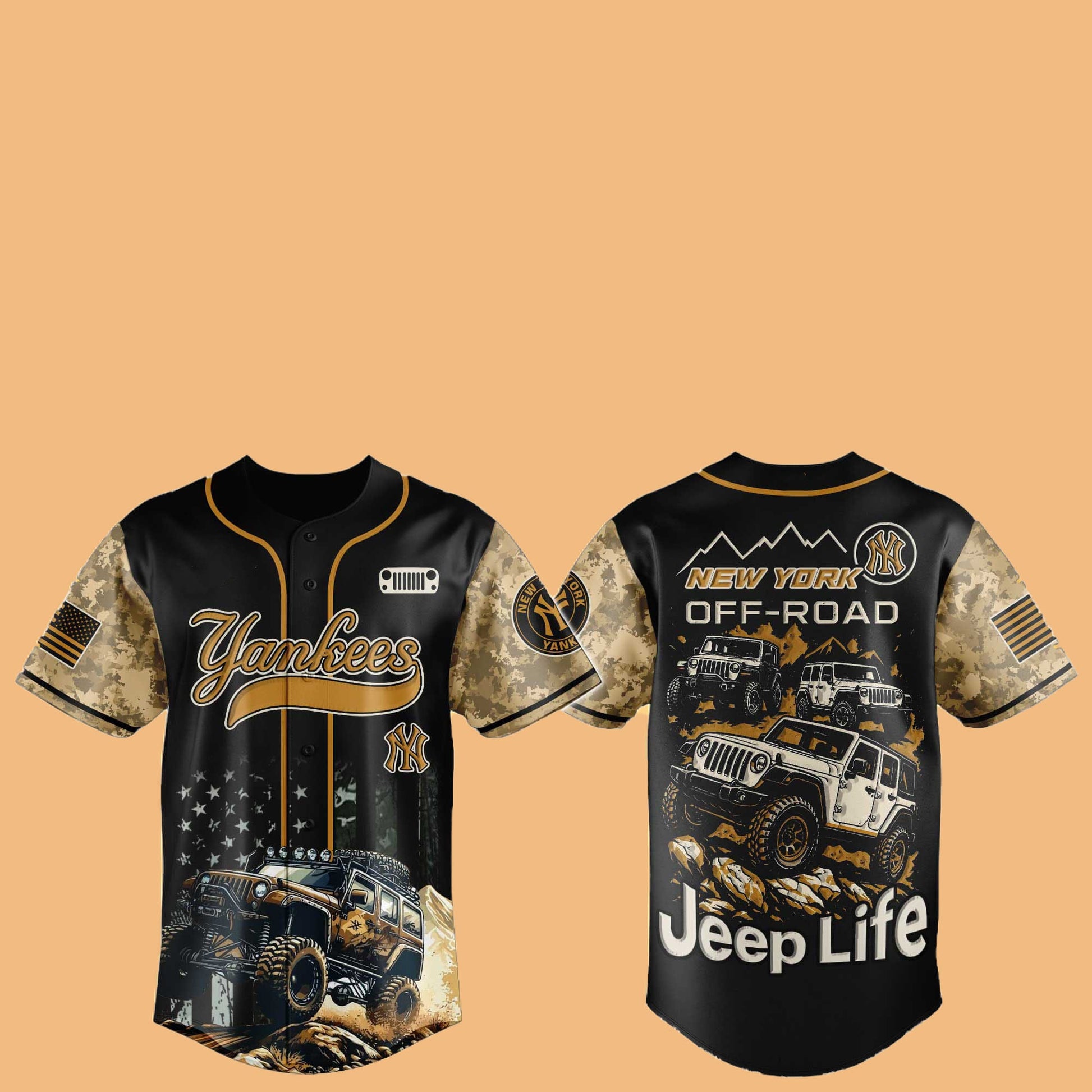 The jersey features custom camouflage-patterned sleeves, which add a distinctive military vibe while showing off your rugged spirit. The Jeep graphics emblazoned across the front and back emphasize the off-road lifestyle, while the Yankees logo on the chest ensures that your love for New York's finest team is always front and center.