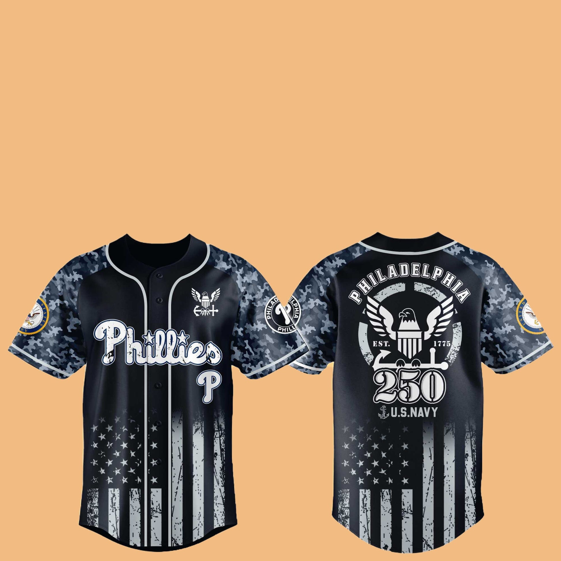 The Phillies 250th US NAVY Hat Jersey 2025 Combo is a commemorative set that blends the legacy of two iconic symbols: the Philadelphia Phillies and the U.S. Navy. Released in celebration of the 250th anniversary of the U.S. Navy, this special edition sportswear piece is designed for those who cherish history, patriotism, and sports. With stunning detailing, this set brings together the best of both worlds, making it a must-have for collectors, sports enthusiasts, and military supporters alike.