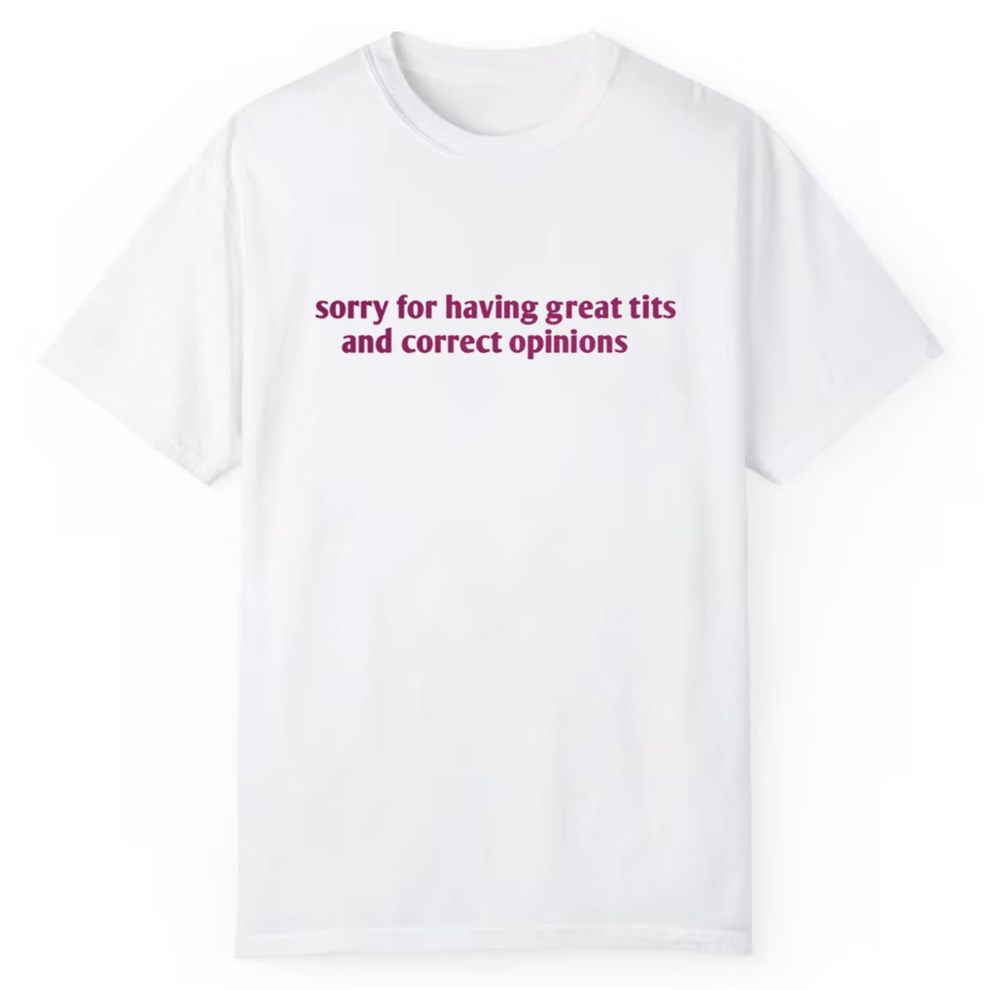At first glance, the design of this shirt may seem cheeky, but it’s a playful and empowering take on the intersection of style and confidence. Whether you're rocking it at a casual hangout, a day out shopping, or just lounging at home, this shirt will draw attention and spark conversations. The printed message, “sorry for having great tits and correct opinions,” is unapologetically confident and encourages others to embrace their strengths without fear of judgment. The font is bold and contemporary, with a deep purple hue that pops against the clean white fabric for an effortlessly stylish look.