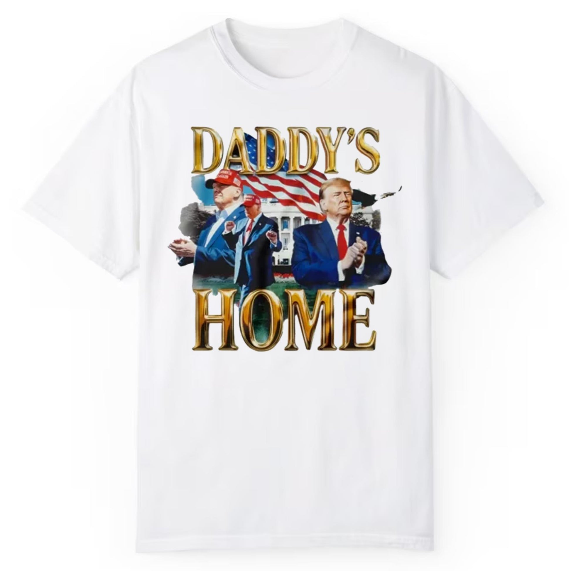 Crafted from high-quality cotton, the Trump Daddy’s Home Shirt promises both comfort and durability. The soft fabric ensures all-day wearability, whether you're heading out for a casual outing or showing your support at a rally. Available in a classic white hue, this shirt features a clean and sharp design that pairs well with a variety of outfits, making it a versatile addition to your wardrobe.